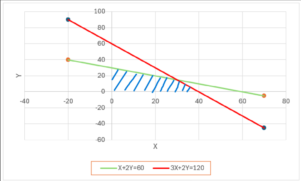 ここで利益=10000(X+Y)を最大化するようにA, Bを選択する必要があるが、今回はそれぞれの利益がともに10000円であるため、X+Yの個数を最大化することと同じである。A, Bに対して制約2, 3の式を代入し、それを線形な式と考え横軸x, 縦軸yのグラフとして記述します。今回の場合、3X+2Y=120とX+2Y=60です。x軸, y軸(制約1)およびこれらの式で囲まれる面積が、今回取りうる値の範囲です。